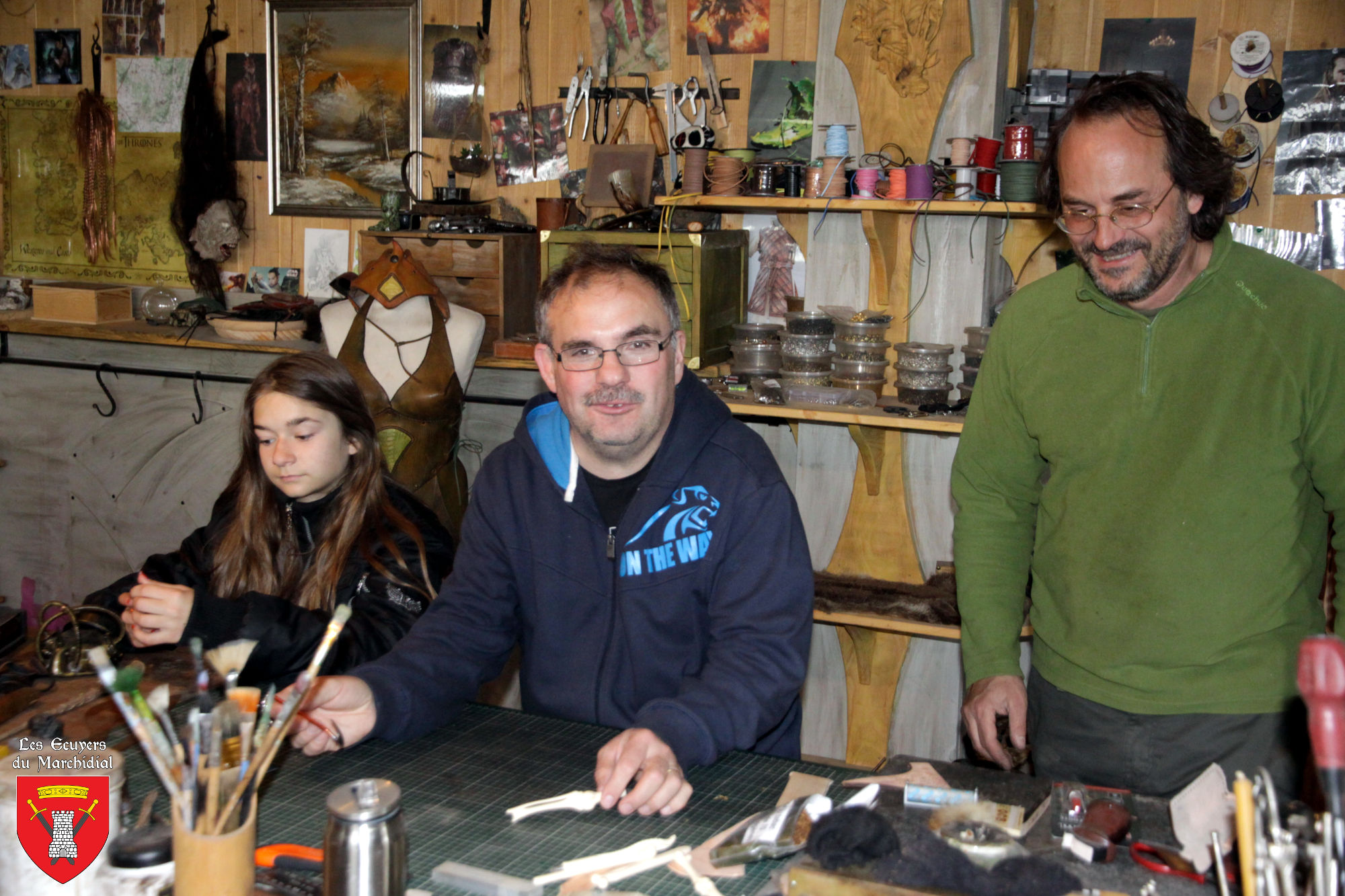 Après un repas tiré du sac, nous avons découvert leur atelier, véritable caverne d’Ali Baba regorgeant de travaux en cours ou achevés sur les thématiques médiévales, fantastique (Harry Potter entre autres !), steam punk, ou de GN…